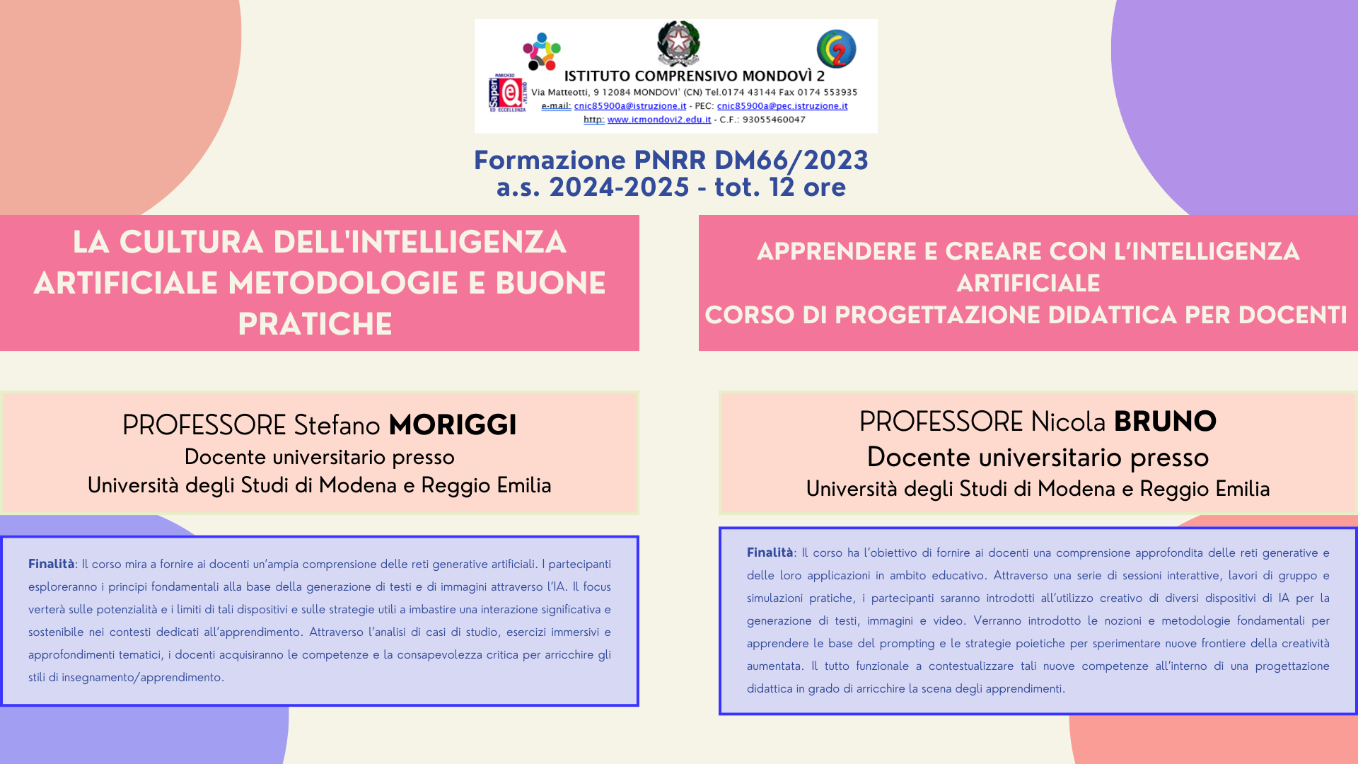 I fondi dei PNRR DM.65/23 (linea di investimento 3.1 “Nuove competenze e nuovi linguaggi” della Missione 4 – Componente 1 del Piano Nazionale di Ripresa e Resilienza ) e PNRR DM. 66/23 (Didattica digitale integrata per promuovere la formazione digitale del personale con la linea di investimento 2.1 , per creare percorsi formativi mirati alla transizione digitale nella didattica) hanno permesso alla scuola di organizzare corsi di formazione di alta qualità i cui formatori sono insegnanti di comprovata esperienza, provenienti anche dal mondo universitario.